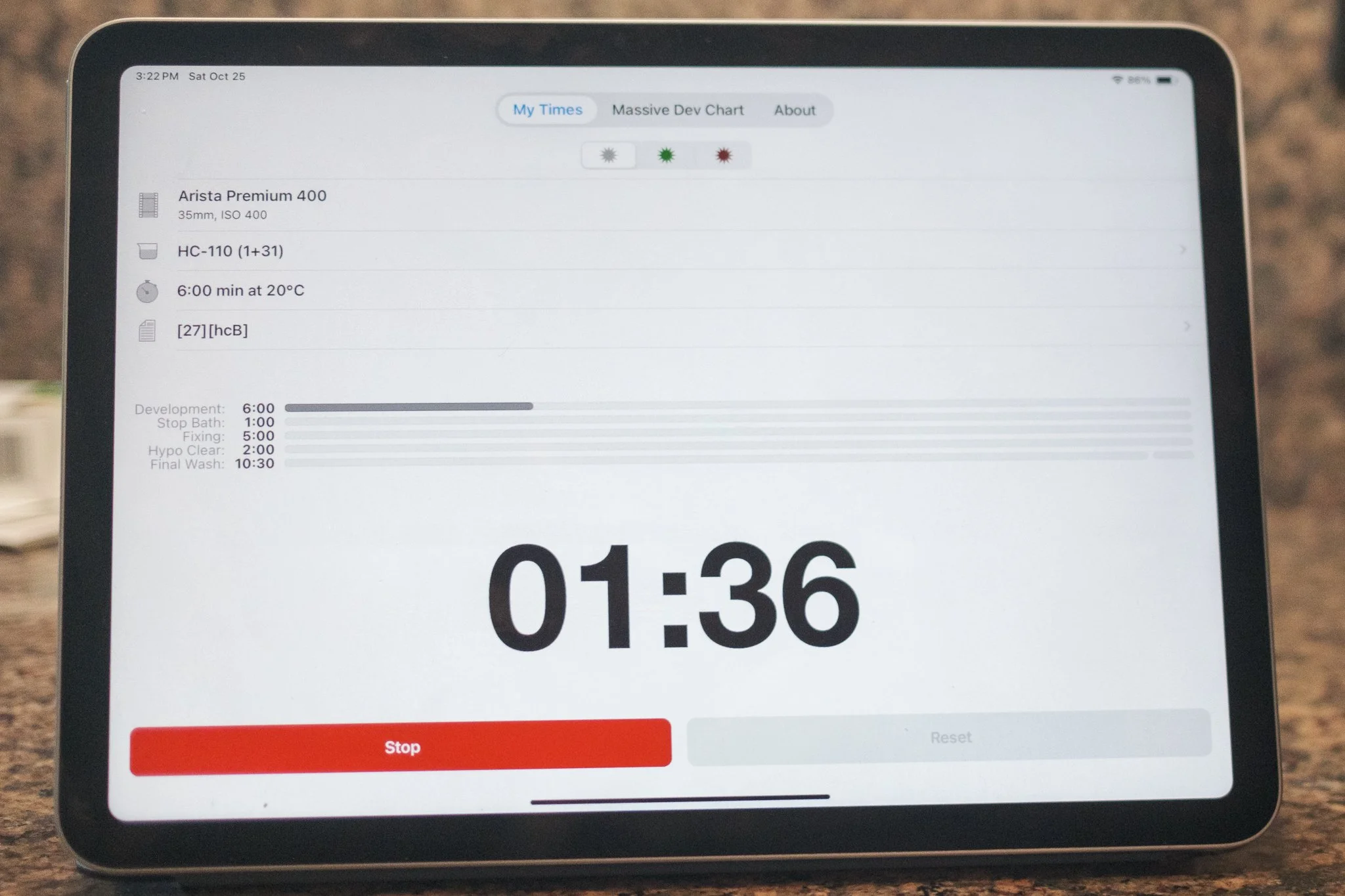 Make sure you know the development, stop and fix times for the chemicals you are using. Stop and fix times will normally be written on the packaging and if you are not using an automated timer like the Massive Dev Chart app, you can find the developing times for your film/developer combination on the Massive Dev Chart website.