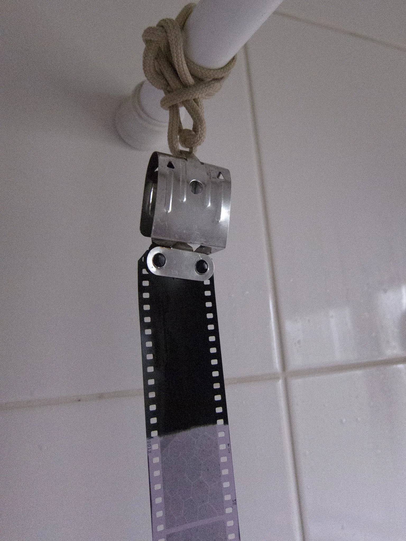 b) Using a film clip (or clothes pin) hang the film somewhere dry and dust free.